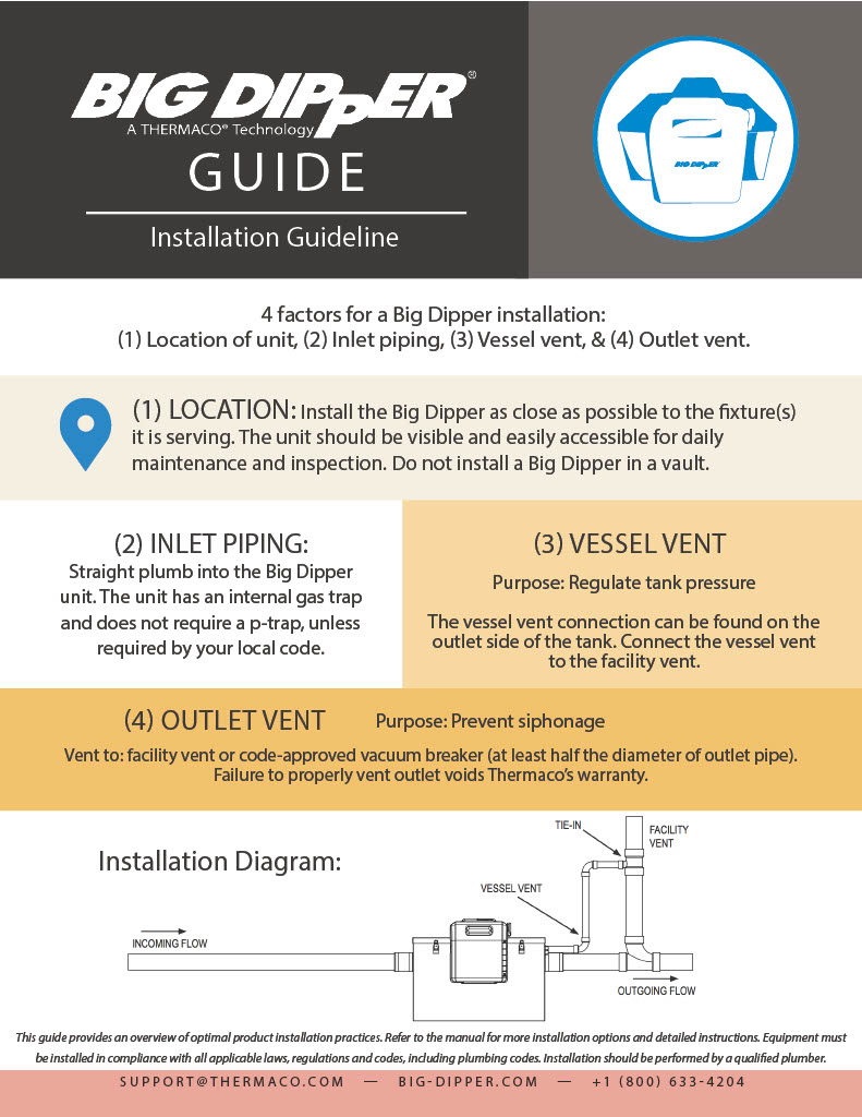 For an overview on Big Dipper installation, click here. This guide covers: location of unit, inlet piping, vessel vent, and outlet vent requirements. Always refer to the manual for more installation options and detailed instructions.